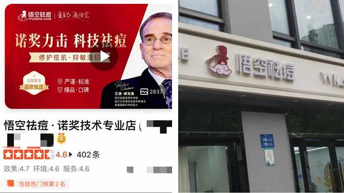 据多位消费者在社交媒体上曝光,痘博士已于2022年初悄悄换名,如今全部改为“悟空祛痘”,实体店铺和广告也已改头换面,原本祛痘套盒也不再有娱乐明星形象,取而代之的是知名诺贝尔奖生理学与医学奖获得者兰迪·谢克曼的“洋代言”,宣传语是“诺奖技术专业店”。