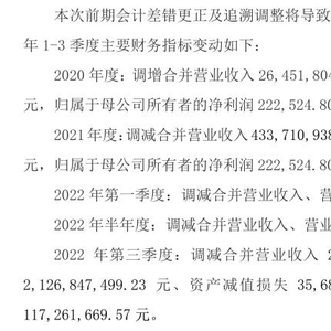 冠农股份此前分别对2020年、2021年及2022年1-3季度主要财务指标进行了更正。来源:公告