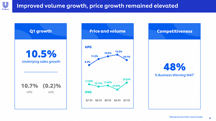 联合利华首席财务官Graeme Pitkethly则在会上补充说道,随着疫情限制的取消,中国的实体店购物和餐厅堂食得以恢复。“一季度,联合利华中国实现了低增长,价格和销量均呈正增长。与本季度初相比,本季度末的增长要强劲得多。”