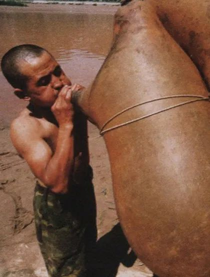 2003年,《民族画报》刊登《黄河羊皮筏子》一文,详细回顾了羊皮筏子的制作工艺。图为工人将剥制好的羊皮囊吹起来。(图片来源:中国民族图片库)