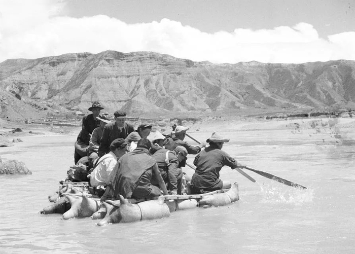 1952年西北军政委员会组织果洛工作团赴果洛了解民情,宣传党的民族政策,争取民心。图为《民族画报》镜头中沿岸藏族群众组织羊皮筏子队帮助工作团渡过黄河。(图片来源:中国民族图片库)
