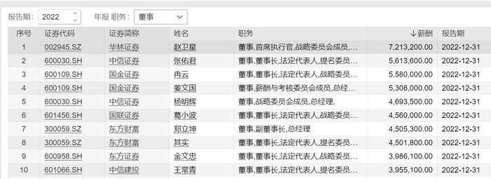 华林证券首席执行官赵卫星以721.32万元年薪位列行业第一。