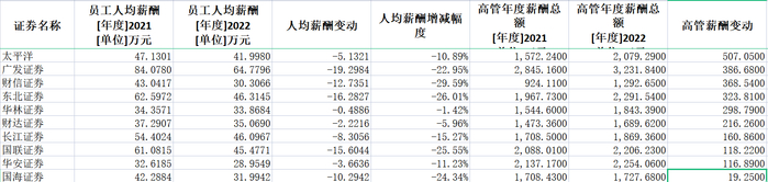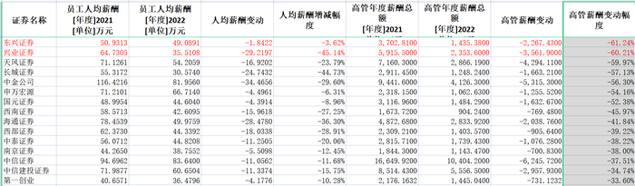 渤海证券、中金公司、财信证券、西部证券、华泰证券、西南证券、东北证券、国联证券、国海证券、天风证券、浙商证券、国金证券、广发证券、国都证券、中原证券、中泰证券降幅则超过20%。这其中只有中原证券因基数低,降薪绝对金额少于10万元。