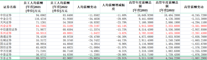 需要指出的是,上述高管薪酬总额降幅较大的券商员工薪酬也出现了不同程度下降,但降幅远小于高管薪酬总额。如东兴证券员工人均年薪仅仅从50.93万元小幅下滑至49.09万元,降幅为1.84%,说明一些券商的普通员工对行业降薪的整体感受或会淡一些。