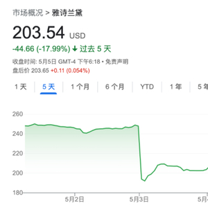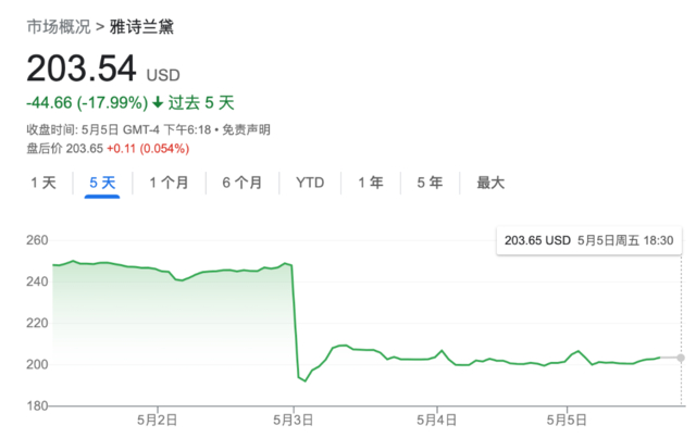 周三,雅诗兰黛再一次下调了业绩指引,为半年内的第三次,导致当日股价暴跌21%,为该集团1995年上市以来跌幅最大的一次。随后几个交易日股价略有反弹,但依然徘徊在低位。
