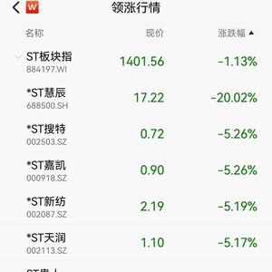 五一假期后仅两个交易日,就有55家被ST或*ST。5月5日,大盘高位震荡,金融等权重股强势。ST板块指数下跌1.13%,*ST慧辰、ST搜特、*ST嘉凯、*ST新纺、ST贵人、*ST金一等近40只ST股跌停。消息面上,随着2022年报公布完成,一批股票被ST或*ST,多股拉响退市警报。