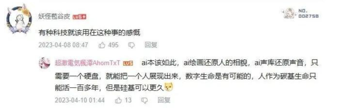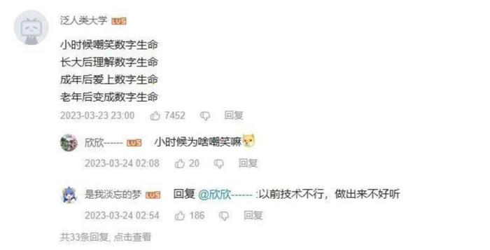 在AI邓丽君的唱歌视频下面,也有很多人对这种数字生命表达了感慨。从嘲笑,到理解到爱上,最后成为数字生命。
