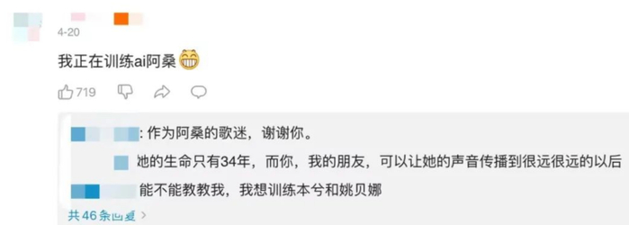 还有一些歌迷,自行训练了张国荣、邓丽君、姚贝娜、阿桑等故去歌手的模型,让久违的声音通过另一种方式重新被听到。在评论区里有不少人听着听着,就流泪了。