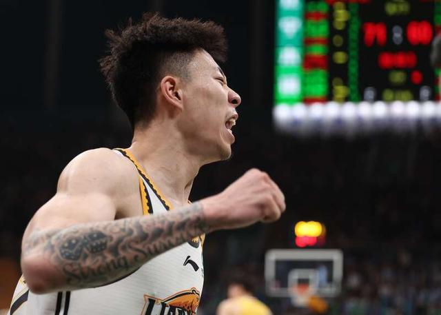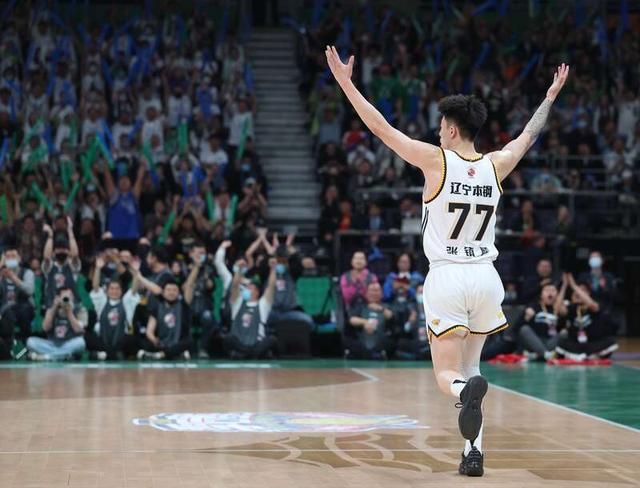 5月5日,辽宁沈阳,2022—2023赛季中国男子职业篮球(CBA)半决赛辽宁本钢队和浙江东阳光队的比赛中,辽宁队77号张镇麟庆祝投中三分球。刘占崑/摄
