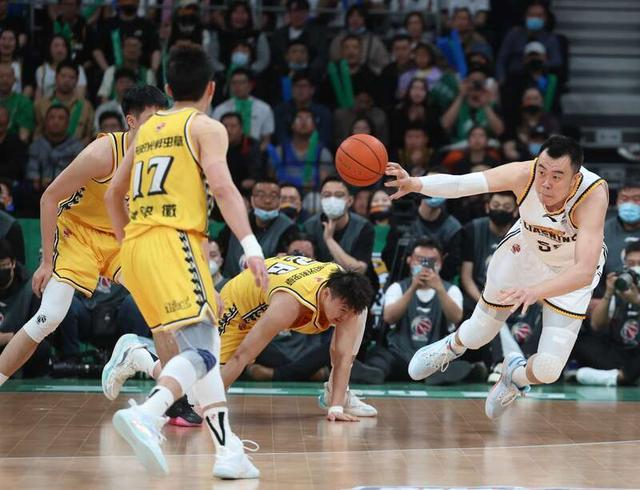 5月5日,辽宁沈阳,2022—2023赛季中国男子职业篮球(CBA)半决赛辽宁本钢队和浙江东阳光队的比赛中,辽宁队3号赵继伟(中)奋力将球传给队友。刘占崑/摄