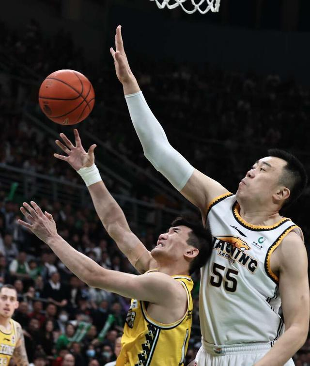 5月5日,辽宁沈阳,2022—2023赛季中国男子职业篮球(CBA)半决赛辽宁本钢队和浙江东阳光队的比赛中,辽宁队55号韩德君(右一)凌空救球。刘占崑/摄