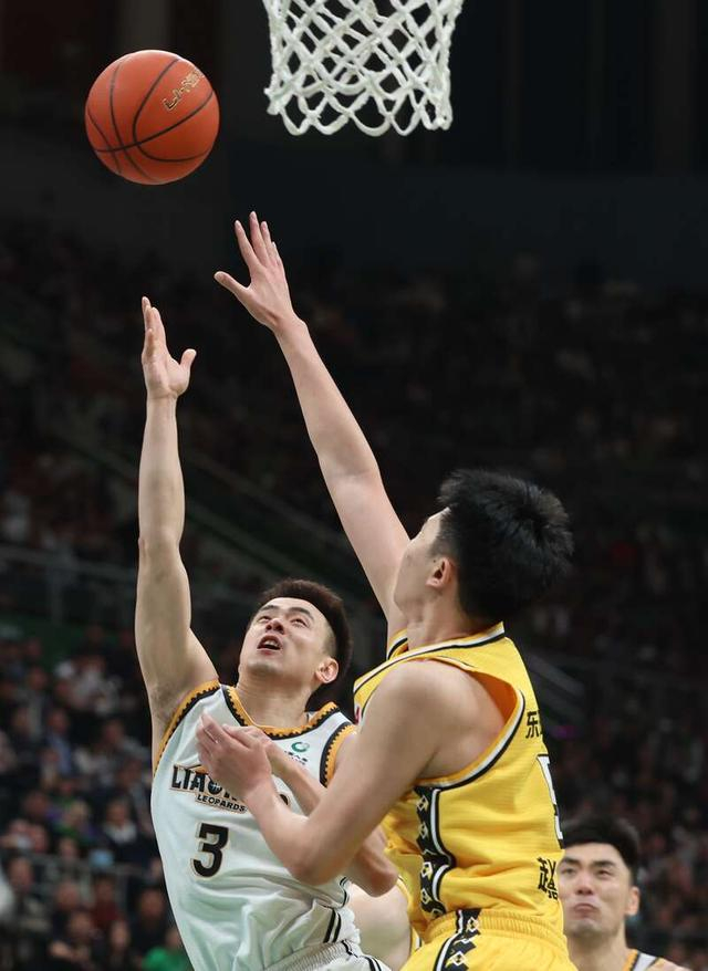 5月5日,辽宁沈阳,2022—2023赛季中国男子职业篮球(CBA)半决赛辽宁本钢队和浙江东阳光队的比赛中,辽宁队3号赵继伟(左)上篮得分。刘占崑/摄