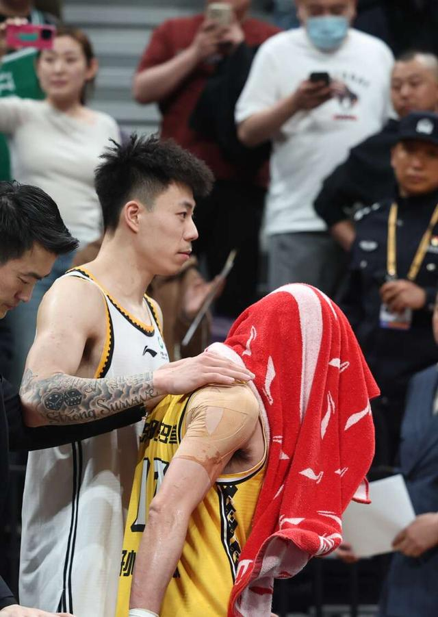 5月5日,辽宁沈阳,2022—2023赛季中国男子职业篮球(CBA)半决赛辽宁本钢队和浙江东阳光队,比赛输球后,浙江东阳光队17号孙铭徽蒙头痛哭。刘占崑/摄