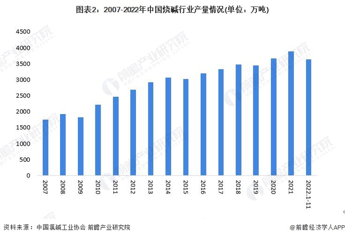 根据中国氯碱工业协会的数据显示,近年来我国烧碱行业产能呈现波动上升态势;从2007年的2181万吨上升至2020年的4470万吨。2021年,我国烧碱产能新增109万吨,退出产能71.5万吨,产能净增长37.5万吨,新增产能释放大多分布于年中,且区域分布较为分散,四季度落地的产能相对较少,全年国内烧碱产量呈现稳中小幅增长态势。2022年上半年,中国烧碱产能达到4309万吨,其中新增产能42.5万吨,淘汰产能7.5万吨,淘汰产能包括安徽八一化工搬迁后暂未投产的15万吨及江苏盐海化工2.5万吨。