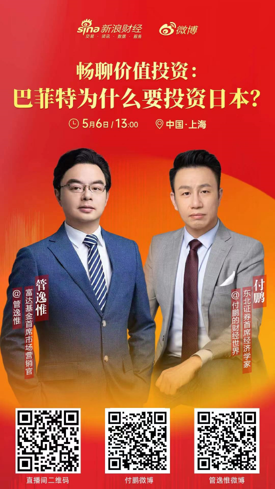 5月6日,新浪财经特别策划了巴菲特股东大会的连麦专场,与各位财经大咖一起解读巴菲特的价值投资理念。付鹏(微博@付鹏的财经世界)在专场直播中,对话了管逸惟(微博@管逸惟)共同探讨巴菲特投资日本的原因。