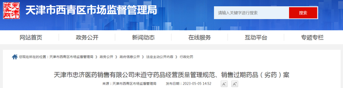 中国质量新闻网讯 近日,天津市西青区市场监督管理局发布天津市忠济医药销售有限公司未遵守药品经营质量管理规范、销售过期药品(劣药)案的行政处罚信息。