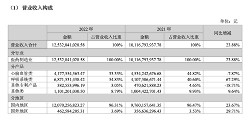 记者梳理此前年报发现,2021年心血管实现营收45.34亿元,占营业收入的44.82%,同比增长31.56%。 2020年心脑血管类产品收入34.47亿元,较上年增长11.31%,其收入在总收入中的占比约40%。