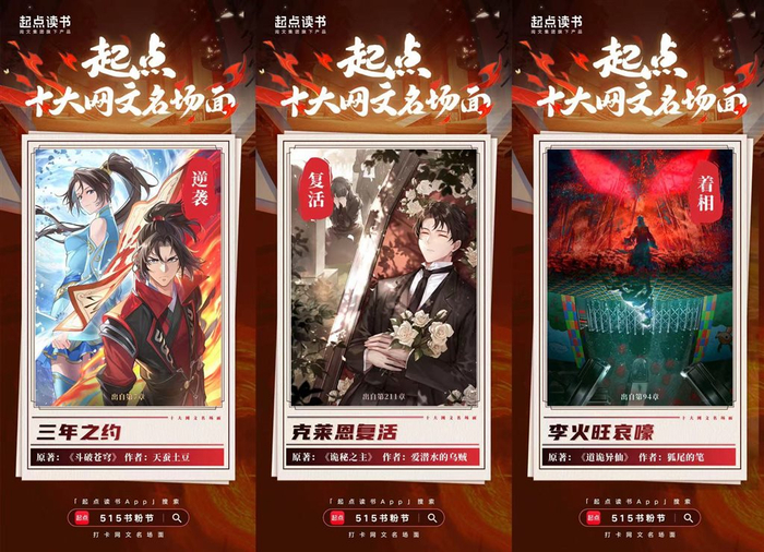 三部作品成书于不同年份,也反映了读者在票选时横跨二十余年的时间选择范围。在最终入选十大名场面的作品中,既有《斗破苍穹》《全职高手》等完结多年的经典,也有《诡秘之主》《大奉打更人》等新近完结的佳作,还有《道诡异仙》《深海余烬》等正在连载的高人气作品,展现了好故事穿越时间的生命力。