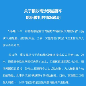 5月6日,据平安库伦官微消息,库伦旗联合工作组通报:5月4日下午,有游客报案称自驾越野车辆在银沙湾景区被“三角铁”扎破轮胎。接到报案后,公安、文旅等部门联合成立工作组深入现场查证处理。