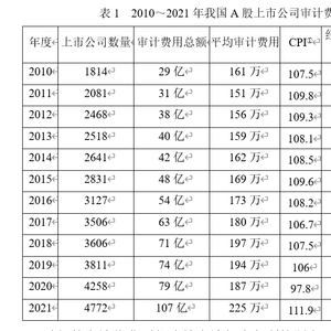 由于审计服务质量难以量化或标准化,特别是现行的招投标机制的设计和“价低者得”的导向,导致社会平均审计收费水平难以反映审计服务应有的报酬。根据国泰安数据库的数据统计,2010—2021年我国A股上市公司审计费用及经CPI调整后的平均审计费用如表1所示。由表1可知,相对于我国上市公司数量的逐年大幅度增加,经CPI调整后的平均审计费用12年来并没有明显的增长。