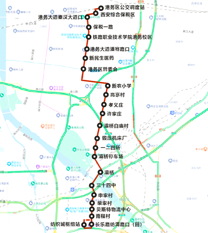 线路设置临时站点24个:纺织城枢纽站、长乐路纺渭路口(回)、南程村、贝斯特物流中心、柴家村、申家村、三十四中、灞桥、灞桥停车场、一二四所、锻压机床厂、灞桥白庙村、许家庄、孝义庄、高寨村、新农小学、港务区管委会、新民生医药、港务大道潘骞路口、铁路职业技术学院港务校区、保税一路、港务大道秦汉大道口、西安综合保税区、港务区公交调度站。