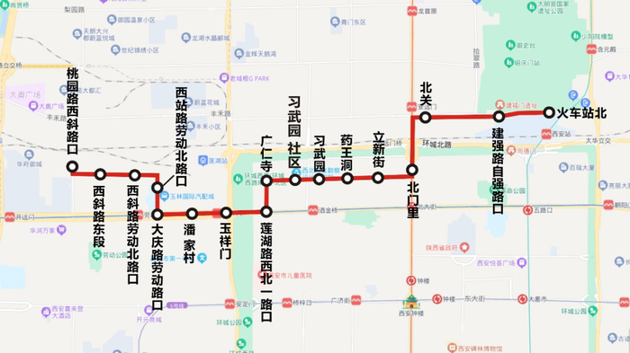 线路设置站点17个:火车站北、建强路自强路口、北关、北门里、立新街、药王洞、习武园、习武园社区、广仁寺、莲湖路西北一路口、玉祥门、潘家村、大庆路劳动路口、西站路劳动北路口、西斜路劳动北路口、西斜路东段、桃园路西斜路口。