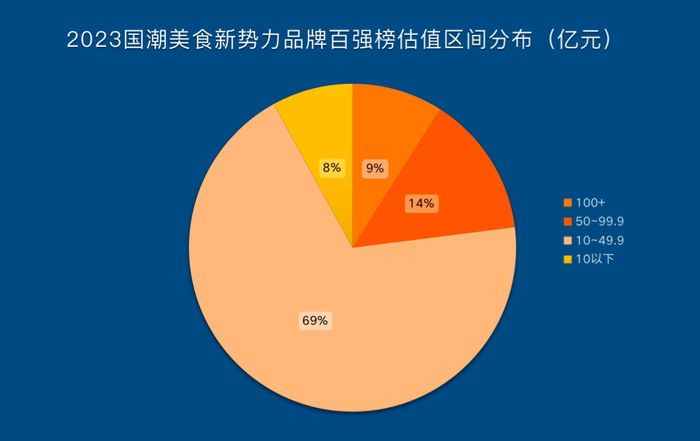 在《2023国潮美食新势力百强榜》上榜的品牌中,估值区间在100亿元以上的品牌有9个,69%的品牌估值集中在10-49.9亿元区间。