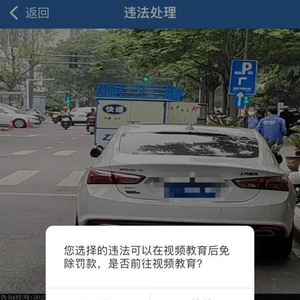 5月6日,王先生打开“交管12123”手机APP处理该违停,打开“违法处理”页面确认违法行为:“不按规定停车”。不过跟以前不同的是,页面弹出一个提示窗口:“您选择的违法可以在视频教育后免除罚款,是否前往视频教育?”