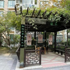 马阿姨常去的凉亭,便是古龙尚居小区标志性的“一亭”,绿藤成荫、绿树环绕,整个凉亭采用了仿古设计,雕栏画栋,门柱前还挂了凉亭的名字和一副对古色古香的对联牌匾。可别小看了这些牌匾,它们背后还有不少讲究呢——