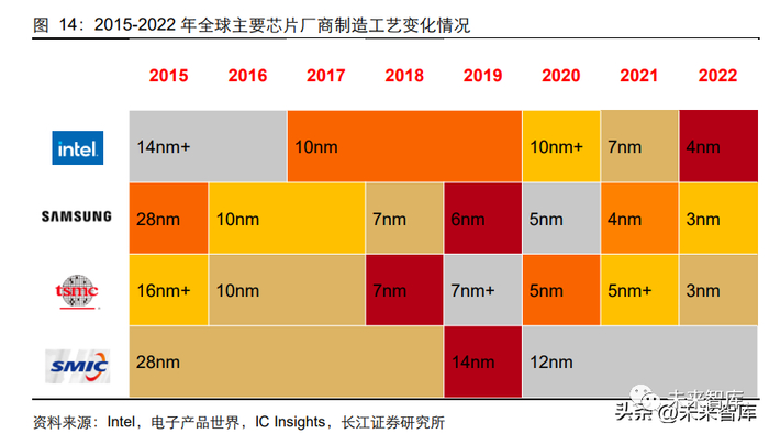 芯片行业的技术变革将增加洁净室工程行业的需求。根据摩尔定律,芯片行业处在持续 的技术变革中。芯片制造工艺水平使企业具有独特的竞争优势,将直接影响芯片生产企 业的市场份额。到 2022 年,三星、台积电已经实现 3nm 芯片的生产,Intel 已经实现 4nm 芯片的生产,各家龙头厂商在竞争率先部署 2nm 先进制程。此外,三星电子称其 3nm 制程使用环绕栅极晶体管技术(GAA),而非成熟的鳍式场效应晶体管技术 (FinFET)。新工艺、新技术的不断应用,将促使芯片企业对现有产线进行升级改造, 进而增加洁净室建造需求。