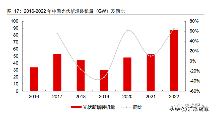 能源转型迫在眉睫,光伏新增装机量保持高增长。我国作为高能源消耗国家,政府正在 致力于低碳经济发展,应对气候变化,二氧化碳排放力争于 2030 年前达到峰值,努力 争取 2060 年前实现碳中和。2022 年,国家发改委、能源局等九部门联合印发《“十四 五”可再生能源发展规划》,目标到 2030 年风电、太阳能发电装机总容量要达到 12 亿 千瓦以上。根据中国光伏行业协会 CPIA 的数据,2022 年中国光伏新增装机量为 87.41GW,同比增长 64.92%。