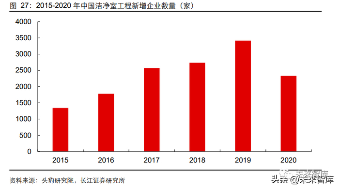 洁净室工程企业数量不断增加,增长幅度下降。根据头豹研究院数据,2015-2019 年中 国洁净室工程新增企业数量从 1349 家不断增长至 3424 家,行业保持快速扩张。2020 年受疫情停工,下游需求收紧等因素影响,新增企业数量下跌至 2339 家,但总体仍然 保持正向增长。不断增加的企业数量加剧了低端市场的竞争,高端市场存在资质壁垒, 资金壁垒等,受新进入者的影响较少。