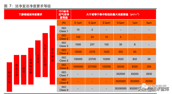 洁净度是衡量洁净室工程水平的重要指标之一。根据国际标准 ISO14644-1 中的有关规 定,洁净度分为 9 个不同的级别。不同行业、不同的生产区域对洁净度的要求各不相同。从行业来看,芯片制造、TFT-LCD、HDD 等电子行业对洁净度的要求较高,医药、食品 等行业对洁净度要求较低。从生产区域来看,洁净室使用空间按照区域可区分为核心区 域和辅助区域。核心区域指最主要的操作或生产场所,对空气洁净等级要求最高,辅助 区域对洁净等级要求相对较低。