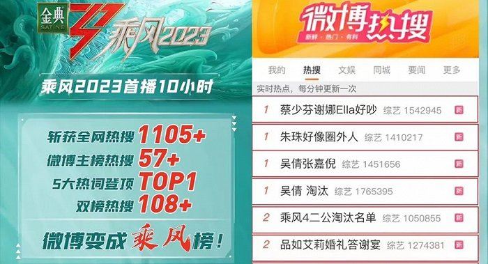 首播仅10小时,斩获全网热搜1105+,#蔡少芬谢娜Ella好吵#、#朱珠好像圈外人#、#吴倩张嘉倪# 等话题接连冲上微博热一,《乘风2023》(犀牛君还是习惯叫它《浪姐4》)仍是内娱综艺里的话题顶流。
