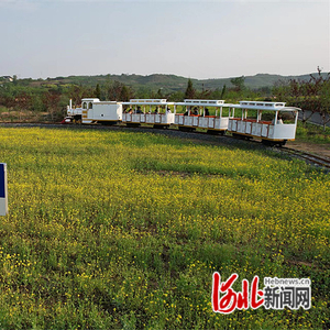 游客乘坐小火车在复兴区东高河村千亩油菜花田观赏油菜花。 通讯员王洪超摄