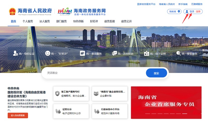 第一步,打开海南政务服务网并登录,如下图: