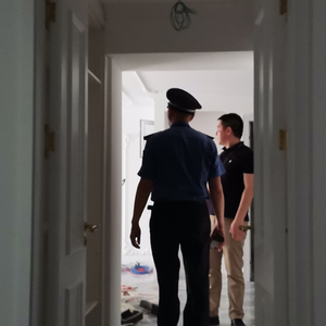 图为执法人员与物业人员在查看现场的墙体。