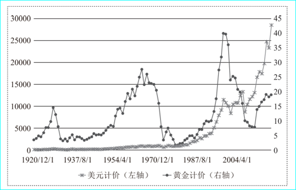 众所周知,美国股市是百年长牛,典型地按照指数函数增长,但是如果我们把道琼斯工业平均指数除以黄金价格,得出的曲线便再也看不出一点儿指数增长的样子。