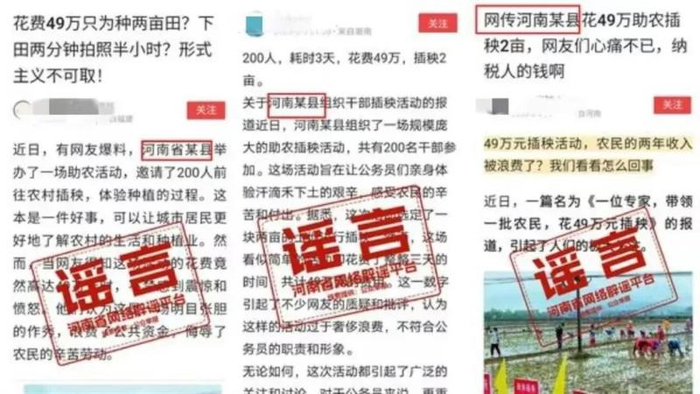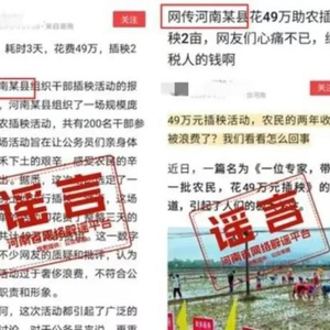 5月6日,河南官方辟谣称,上述信息引用的有关农耕活动及配图,出自湖南宁乡灰汤镇农耕民俗文化节。6日晚,灰汤镇政府向记者确认,这是镇上举办的第二届农耕民俗文化节,但网传的图文信息不属实。河南省网络辟谣平台显示,5月4日至5日,多个网络账号杜撰称“河南某县助农活动花费49万元”“河南某县组织200名干部,耗时3天,花费49万插秧2亩”“河南某县一位专家带领一批农民花49万插秧2亩”。经查,上述网络谣言引用的有关农耕活动及配图,出自2023年4月14日的湖南省宁乡市灰汤镇第二届农耕民俗文化节活动。