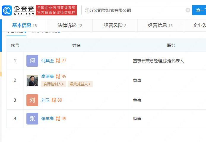 而企查查显示,除了控股新霖飞的“何其金”,江苏波司登制衣有限公司(以下简称江苏波司登)董事长兼总经理、法定代表人也是“何其金”。按企查查的信息,江苏波司登的实际控制人、董事是波司登创始人高德康。