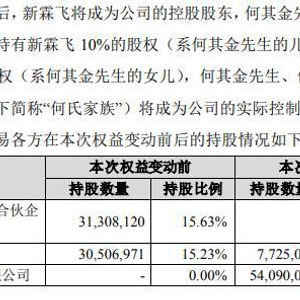 据会畅通讯公告,会畅企管和黄元元拟将其直接持有的公司股份合计5409万股(占公司目前总股本的27%)转让予新霖飞。股权交易价格为19.47元/股,股份转让总价款共计10.53亿元。
