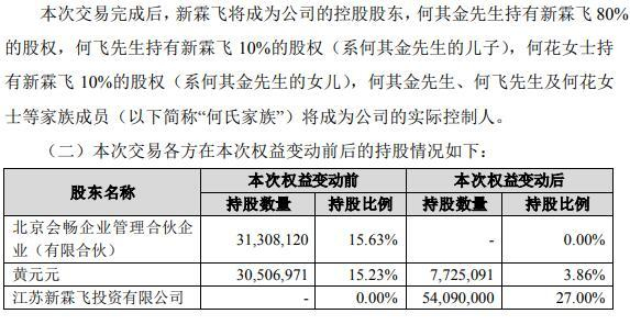截至一季度末,会畅企管持有会畅通讯3130.81万股股份,持股比例为15.63%,为公司第一大股东;黄元元持有会畅通讯3050.7万股股份,持股比例为15.23%,为公司第二大股东。上述股权交易完成后,会畅企管、黄元元的持股比例将分别下降至0%、3.86%,持股27%的新霖飞将成为会畅通讯控股股东。