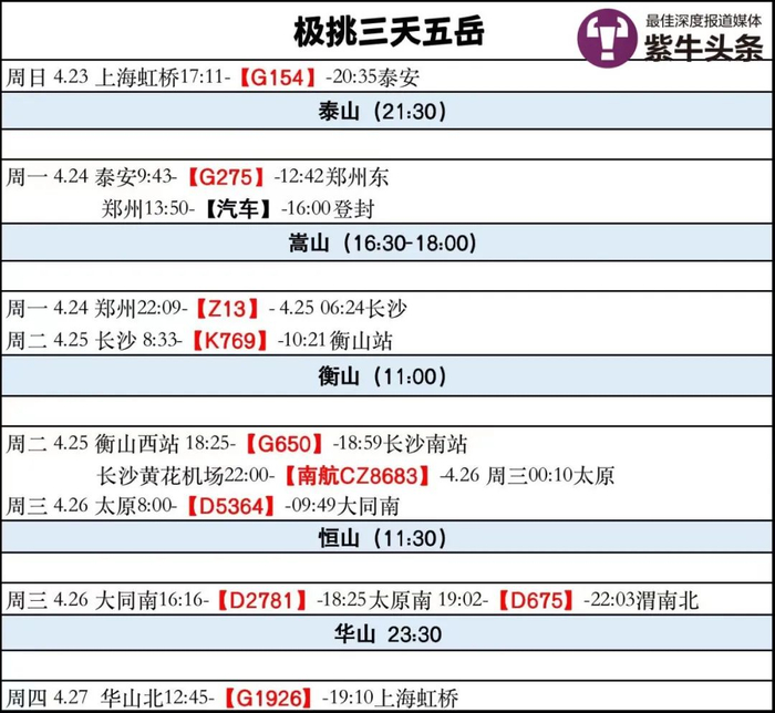 游遍五岳是很多人的梦想,用尽可能短的时间打卡五大名山更是成为一些旅游爱好者的目标,那么能做到多短的时间呢?两位90后小伙在五一假期前给出一个答案:三天!他们在中国现代基建的助力下,在大约三天的时间里行程4600多公里,先后打卡泰山、嵩山、衡山、恒山和华山。完成这趟旅程之后,他们告诉扬子晚报紫牛新闻记者,一路上收获颇丰,既为祖国广阔壮丽的景色和高度发达的基建感到自豪,也觉得完成了一次人生壮举。不过他们提醒说,三天游五岳对身体条件要求很高,一定要量力而行,不要轻易模仿。