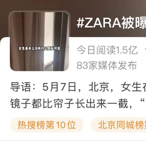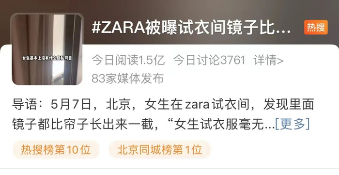 5月7日,#zara被曝试衣间镜子比帘子长一截#话题突然上热搜。