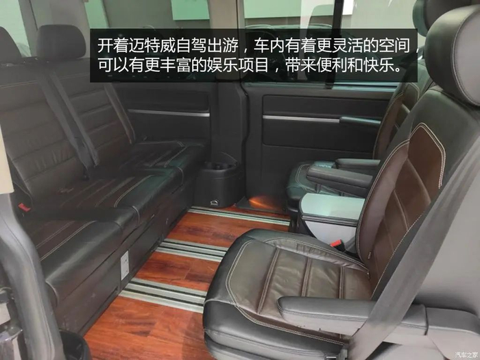 迈特威比较经典的设计是第二排座椅可以向后180度旋转,同时两个座椅中间的扶手还可以打开拓展成桌子,车内空间非常灵活。