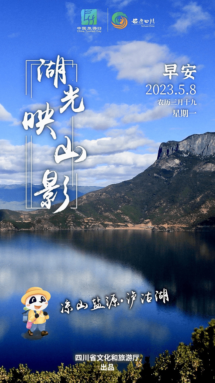 5月8日,星期一。今天安逸四川日历海报带大家走进凉山州盐源县泸沽湖,看湖光映山影的别致美。