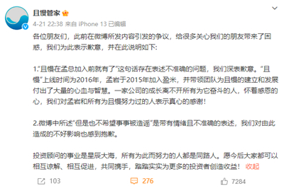 或许是理亏,或许是心虚,且慢官微随后删除了上面的微博。事情发酵两天后,4月21日晚,且慢官微终于发了一份道歉声明: