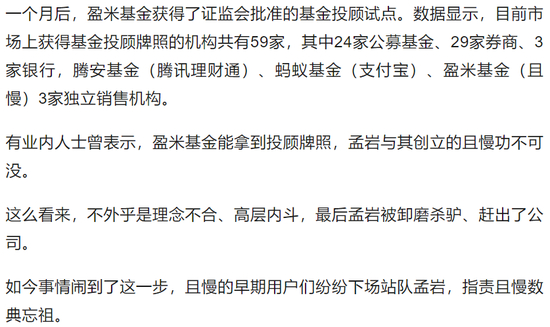 此外,文中还提到了孟岩和盈米的管理层之间的分歧: