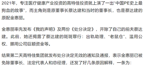 金惠丽已脱离职场多年,常年为全职家庭主妇,“作为PE行外人士,无视自己的能力边界,听信谗言,大搞派系,肆意对员工发泄恶评,将高特佳的核心机密泄露给竞争对手等”。
