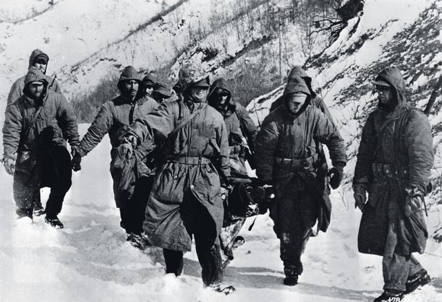 陆战1师士兵正用担架抬着伤员送往机场,将其空运后方兴南,摄于1950年12月。来源/视觉中国
